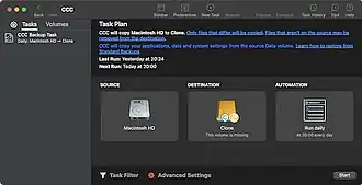CCC's main window lets users select a source disk and a destination disk, and optionally deselect source files or folders from being copied. It supports backup scheduling.[2][4][5]