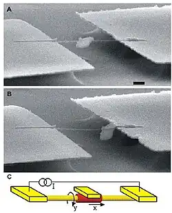 - ^ a b c d Fennimore, A. M.; T.D. Yuzvinsky; Wei-Qiang Han; M. S. Fuhrer; J. Cumings; A. Zettl (2003). "Rotational actuators based on carbon nanotubes". Nature. 424 (6947): 408–410. Bibcode:2003Natur.424..408F. doi:10.1038/nature01823. PMID 12879064. S2CID 2200106.