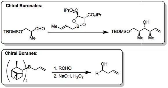 Allylic boronate and -borane reagents have also been developed for enantioselective addition to carbonyls—in this class of reactions, the allylic boron reagent confers stereochemical control[5]
