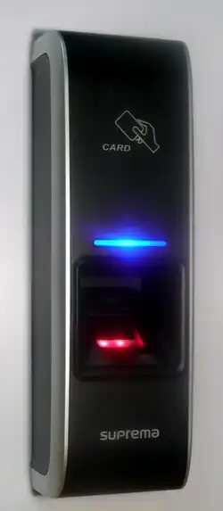 A contactless smart card reader uses high-frequency radio waves (13.56 MHz, as opposed to 125 kHz used in low-frequency proximity card readers), enabling faster data transfer rates (up to 848 kbit/s) and communication with multiple cards simultaneously through anti-collision protocols defined in standards like ISO/IEC 14443[3]. This allows contactless smart cards to transmit more data efficiently compared to lower-frequency systems and supports applications such as access control and electronic payments without requiring physical contact with the reader. Contactless smart cards do not require physical contact with the reader and can function through materials like wallets or purses, typically within a range of 20 inches (51 cm) or less, depending on the reader's power and configuration. Most access control systems only read serial numbers of contactless smart cards and do not utilize the available memory. Card memory may be used for storing biometric data (i.e. fingerprint template) of a user. In such case a biometric reader first reads the template on the card and then compares it to the finger (hand, eye, etc.) presented by the user. In this way biometric data of users does not have to be distributed and stored in the memory of controllers or readers, which simplifies the system and reduces memory requirements.