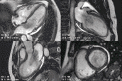 CMR uses the same basic principles as other MRI techniques. Imaging of the cardiovascular system is usually performed with cardiac gating using an adaptation of conventional ECG techniques.[19] Cine sequences of the heart are acquired using balanced steady state free precession (bSSFP) which has good temporal resolution and intrinsic image contrast. T1-weighted sequences are used to visualize anatomy and detect the presence of intra-myocardial fat. T1 mapping has also been developed to quantify diffuse myocardial fibrosis.[20] T2-weighted imaging is mainly used to detect myocardial edema which may develop in acute myocarditis or infarction. Phase-contrast imaging uses bipolar gradients to encode velocity in a given direction and is used to assess valve disease and quantify shunts.
