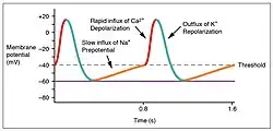 At this point, calcium channels open and Ca2+ enters the cell, further depolarizing it at a more rapid rate until it reaches a value of approximately +5 mV. At this point, the calcium ion channels close and potassium channels open, allowing outflux of K+ and resulting in repolarization. When the membrane potential reaches approximately −60 mV, the K+ channels close and Na+ channels open, and the prepotential phase begins again. This process gives the autorhythmicity to cardiac muscle.[1]