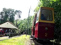 A short 18 in (457 mm) gauge tramway and electric trams were built by members of Cardiff Model Engineering Society (including a former employee of Cardiff Corporation Tramways). The trams run on a 200 m (220 yd) track at the Society's grounds in Heath Park,[14] where visitors can ride the tram.[15]