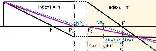 The nodal points characterize a ray that goes through the centre of a lens without any angular deviation. For a lens in air with the aperture stop at the principal planes, this would be a chief ray since the nodal points and principal points coincide in this case. This is a valuable addition in its own right to what has come to be called "Gaussian optics", and if the image was in fluid instead, then that same ray would refract into the new medium, as it does in the diagram to the right. A ray through the nodal points has parallel input and output portions (blue). A simple method to find the rear nodal point for a lens with air on one side and fluid on the other is to take the rear focal length f′ and divide it by the image medium index, which gives the effective focal length (EFL) of the lens. The EFL is the distance from the rear nodal point to the rear focal point.