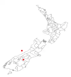 It is found in the South Island from the Mackenzie Basin, to Waitaki and Central Otago, on alluvial terraces, and slopes and on river flats.[4]