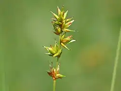 It is known in the British Isles as "spiked sedge",[1][4] in North America as "spicate sedge"[5] or "prickly sedge".[6] In Irish it is called cíb spícíneach,[7] and in Welsh, its name is hesgen dywysennog borffor,[8] hesgen dywysennog[9] or hesgen ysbigog borffor.[10]