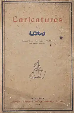 Caricatures by Low (New Popular Edition) is a large-format (25 by 37 centimetres (9.8 in × 14.6 in)) 110pp book of drawings by David Low, "collected from the Sydney Bulletin and other sources", and published in 1915 by Tyrrell's Limited, 99 Castlereagh Street, Sydney. The images listed below are out of copyright in the USA but not in Australia.