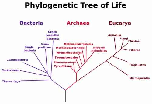In 1977, Woese and George E. Fox experimentally disproved this universally held hypothesis about the basic structure of the tree of life.[27] Woese and Fox discovered a kind of microbial life which they called the “archaebacteria” (Archaea).[6] They reported that the archaebacteria comprised "a third kingdom" of life as distinct from bacteria as plants and animals.[6] Having defined Archaea as a new "urkingdom" (later domain) which were neither bacteria nor eukaryotes, Woese redrew the taxonomic tree. His three-domain system, based on phylogenetic relationships rather than obvious morphological similarities, divided life into 23 main divisions, incorporated within three domains: Bacteria, Archaea, and Eucarya.[4]