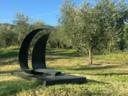 Carla Lavatelli's sculptures are in many prominent museum and private collections across the United States and Europe, as well as in public and communal spaces and university campuses. Notable examples include her first abstract work, Ginko Biloba (1971), carved from red Persian travertine, which is located in the Phillips Collection in Washington, D.C.[4] The work had been gifted to the Phillips by Lavatelli in 1974 on the occasion of her exhibition there the same year.[30] Other important works include Stele For a Prayer (1971), a monolithic work in white Carrara marble and slate in the collection of the San Francisco Museum of Modern Art.[3] Her carved stone and silver jewelry, which she called "Sculptures to Wear" are in the collection of the Minneapolis Institute of Arts.[31] Several versions of Lavatelli's large-scale abstract sculpture in bronze and stainless steel, 1 ½ (1969–70), are in the museum collections of institutions such as Stanford University in Palo Alto, California, and Brown University in Providence, Rhode Island.[6] Originally installed on the Stanford campus in front of the law school, 1 ½ was restored in 1996 by Lavatelli and relocated in the Fairchild Chapel.[32] At Brown, 1 ½ has been on view in front of the brutalist high-rise Science Library building since its installation in 1985.[33] Bill Van Siclen, an art critic for the Providence Journal, remarked in a 2007 article that Lavatelli's 1 ½ resembled a “giant chrome-plated engine part,” and that “had she not become a sculptor, [she] clearly had a future as a sports car designer.”[34] In 1978, Lavatelli was commissioned to permanently install a spherical bronze sculpture in a newly created pond at the Botanical Gardens in Freiburg, Germany, which she titled Golden Pond.[35] During the 1990s, she worked on several temporary and permanent site-specific installations, including "happenings" involving paper and reed sculptures in Pistoia, Italy, and New York. In 1995, the town of Mougins, in France, commissioned her to create a stone bench installation with a fountain set into a rough-hewn travertine in Place du Banc des Amis off the Rue d'Eglisse.[36] On the occasion of the unveiling of the sculpture, Lavatelli was presented with the town's honorary Gold Medal in 1995.[1]