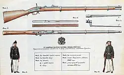 In order to rearm the infantry, the arms plants within the Russian Empire started manufacturing rifled muskets. The M1856 rifle was a muzzle-loading rifle that was fit with a percussion cap mechanism.[2] The M1856 rifle was chambered with a 15,24 mm calibre - often referred to as the 'six-line' in Russian. It had a length of 1340 mm with a barrel length of 939 mm. It weighed 4.4 kg. The rifled was designed to be loaded with 4,78 g of gunpowder and the bullet weighed 35,19 g. The M1856 had a muzzle velocity of 348 m/s.[3]