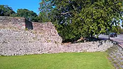 The West Walls are still needed to retain a former river cliff on the River Caldew and were not demolished. They have however been considerably altered over the years. Comparisons between old engravings and current archaeological evidence suggest the wall has been straightened.[7] Between the bridge and the castle, there were houses built up against the walls until 1952.[8] Other buildings erected against the walls have been largely removed so the walls are visible again. Remaining buildings have been listed because they incorporate wall fragments.[9]