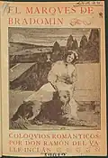 Among noventayochistas Valle-Inclán is perhaps the most controversial figure when it comes to defining his position towards Carlism.[161] It remains beyond doubt that the motive, though not omnipresent, features very prominently in his novels, from the Sonatas tetralogy (1902–1905) to the La Guerra Carlista trilogy (1908–1909) to the El ruedo ibérico series (1927–1932), apart from works which do not fall into the above cycles, first of all La Corte de Estella (1910). The controversy is whether the apparent exaltation of Carlism, demonstrated by many of his protagonists and not infrequently also by storytellers of his novels, should be taken at face value or whether it is part of an ironic and perhaps provocative discourse.[162] Quoting numerous and undeniable biographical details[163] some claim that Valle-Inclán was a genuine though somewhat heterodox Carlist.[164] Others point to apparently incompatible episodes from his biography, e.g. being awarded a high Carlist honor in 1931,[165] co-founding Asociación de Amigos de la Unión Soviética in 1933 and declaring himself an admirer of Fascism and Mussolini in 1936;[166] they square the circle by concluding that Carlism was one of many masks that Valle-Inclán used to wear.[167]