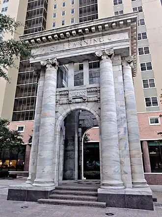 The Carnegie Education Pavilion, more often known as the Carnegie Monument, is a marble Beaux-Arts monument located in Atlanta, Georgia, United States. The pavilion was constructed in 1996 from the exterior facade of the Carnegie Library, named after Andrew Carnegie. The monument pays homage to the legacy of Carnegie by serving as a monument to higher education in Atlanta, with the seals of nine local area colleges and universities embedded in the floor of the monument.[1] The monument was commissioned in 1996 by the Corporation for Olympic Development in Atlanta and designed by Henri Jova. The pavilion is located in Downtown's Hardy Ivy Park, at the curve in Peachtree Street where it diverges with West Peachtree Street.[2] The monument's inscription reads: "The Advancement of Learning." It also features the inscriptions of the names of three famous Western poets "Dante", "Milton", and "Asop", in addition to the library's namesake, "Carnegie".[3]