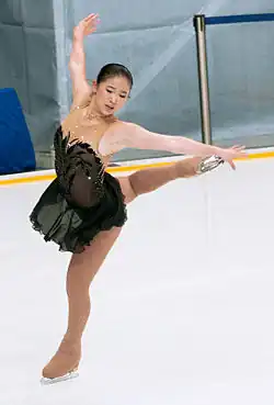 Zhang has performed a spin position that her mother has called the Pearl spin,[39] a cross between a catch-foot layback spin and a Biellmann spin. In this spin, the free leg is brought up to waist-height and the free blade is grasped with both hands. The back and head are bent down towards the knee, with the free leg held above the head in a Biellmann position. This makes the spin, in essence, a catch-foot layback in a Biellmann position, because the Biellmann position, according to regulations, is achieved when the level of the boot passes the head so that the boot is above and behind or over the head.[40] It is a layback spin because it is an upright spin with the head and shoulders dropped backwards and the back arched downwards toward the ice.[41] This position has become Zhang's signature spin.[42]