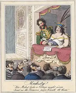Gossip about Caroline and George's troubled marriage was already circulating.[23] The newspapers claimed that Lady Jersey opened, read and distributed the contents of Caroline's private letters.[24] She despised Lady Jersey and could not visit or travel anywhere without George's permission.[25] The press vilified George for his extravagance and luxury at a time of war and portrayed Caroline as a wronged wife.[26] She was cheered in public and gained plaudits for her "winning familiarity" and easy, open nature.[20] George was dismayed at her popularity and his own unpopularity, and felt trapped in a loveless marriage with a woman he loathed. He wanted a separation.[27] In April 1796, George wrote to Caroline, "We have unfortunately been oblig'd to acknowledge to each other that we cannot find happiness in our union. ... Let me therefore beg you to make the best of a situation unfortunate for us both."[28] In June, Lady Jersey resigned as Caroline's Lady of the Bedchamber.[29] George and Caroline were already living separately, and in August 1797 Caroline moved to a private residence: The Vicarage or Old Rectory in Charlton, London.[30] Later, she moved to Montagu House in Blackheath. No longer constrained by her husband, or, according to rumour, her marital vows, she entertained whomever she pleased.[31] She flirted with Admiral Sir Sidney Smith and Captain Thomas Manby, and may have had a brief relationship with the politician George Canning.[32]