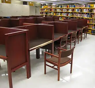 Carrel desks are especially common in academic libraries.[2] Sometimes the seat is integrated with the carrel desk. They may also have a shelf, built-in illumination, electrical outlets, or Ethernet ports.[1] Unlike the cubicle desk, carrel desks usually have no file drawers or other facilities. They are designed to stand alone or to be grouped together, with or without common sides or walls.