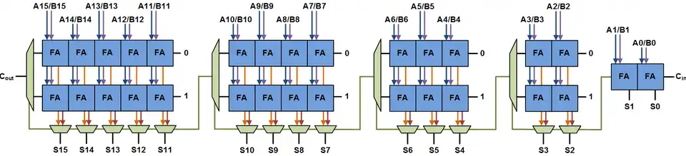 A 16-bit carry-select adder with variable size can be similarly created. Here we show an adder with block sizes of 2-2-3-4-5, this is the special type of Variable-sized carry select adder, called as square root carry select adder.[2] This break-up is ideal when the full-adder delay is equal to the MUX delay, which is unlikely. The total delay is two full adder delays, and four mux delays. We try to make the delay through the two carry chains and the delay of the previous stage carry equal.
