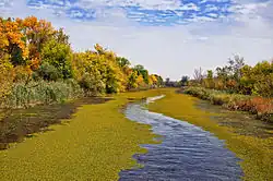 Some areas of water are covered in pond algae.[4] Many rare and autochthonous plants live in the wetland, but also many imported ones. Some representatives of the water plants include water fern, European white water lily, yellow water lily,[9] lax-flowered orchid.[9] Meadow plants are represented by Plumbago, Achillea, wormwood, mallow and meadow sage, and marsh plants by flowering rush, yellow flag iris, water mannagrass, common sweet flag, bulrush,[4] reed,[4] etc.