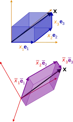 In another rectangular coordinate system, x as a contravector has coordinates xi and basis ei, while as a covector it has coordinates xi and basis ei, and we have:
