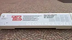 Despite being state-owned and continuous protests by German-speaking South Tyroleans, the relief remained untouched for decades. In 2011, the Italian Minister of Culture Sandro Bondi finally agreed to a contextualisation or removal of several fascist era remains in the province during negotiations with members of parliament of the South Tyrolean People's Party about an upcoming vote of no-confidence.[1] In 2017, like the Bolzano Victory Monument,[2] the Piffrader frieze was also subjected, on the initiative of the South Tyrolean Provincial Administration and on the basis of a joint historical commission proposal,[3] to an intervention of historicization and recontextualization, on an artistic project by Arnold Holzknecht and Michele Bernardi, with the affixing of an illuminated inscription bearing a quotation from the philosopher Hannah Arendt in three languages (Italian, German, Ladin) — "No one has the right to obey" — as opposed to the fascist dogma of Believe, obey, combat (Credere, obbedire, combattere) still present on the bas-relief.