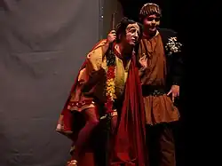 A common pattern in Plautus is for a metrical section to begin with iambic senarii (which were unaccompanied by music), followed optionally by a musical passage or song, and ending with trochaic septenarii, which were recited or sung to the music of a pair of pipes known as tibiae.[8]