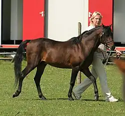 The breed was rediscovered in 1965 by an Iranian aristocrat in Tehran, Narcy Firouz, and his American-born wife, Louise Laylin from a base stock of a small number of small horses found in the Elburz Mountains in Amol.[1][2][3] In 2011, the remains of a small horse dating back to 3400 B.C.E. were found at Gohar Tappeh, Iran, giving rise to claims that today's Caspian originates from the oldest known breed of the domestic horse. It is also one of the rarest horse breeds and its population status is critically endangered.[1]