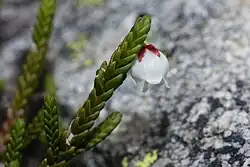 This heather is native to subalpine areas of western North America, from Alaska to the mountains of California. It is a small, branching shrub which forms patches along the ground and in rocky crevices.[1]