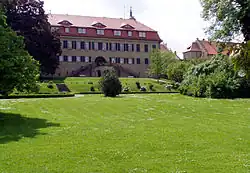 Schloss Castell (Castell palace), built in the late 17th century in Baroque style, remains the seat of the princely family of Castell-Castell. Around 1820, the formal Baroque garden was turned into an English landscape garden. Between 1863 and 1869 Graf Friedrich Ludwig (1791-1875) had the Torbau, the eastern wing and the corner pavilions rebuilt and expanded in Baroque revival style. A new stables was added at that time, which serves today as the restaurant Weinstall. Around 1870, the park was expanded based on plans by Carl von Effner. These Anlagen feature a pond, a new stables, a riding hall and the Wiedervereinigungsstein from 1991 by Theo Steinbrenner.[4]