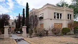 The Castle Apartments were designed by the El Paso firm of Trost & Trost with George P. Hill.[5] It was a U-shaped, two-story building with a central courtyard opening onto Central Avenue. The front elevation was symmetrical, with two projecting entrance bays on each of the side wings and one in the center, all topped with triangular pediments. Other ornamentation was restrained, consisting of simple string course and cornice moldings and a subtly crenellated parapet. The exterior walls were finished with cream-colored stucco and contained over 100 original wood-framed sash windows.