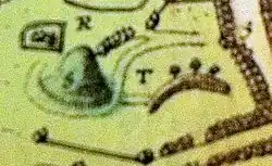 John Speed's depiction of Castle Howe in 1611, with the motte (l) and bailey (r)