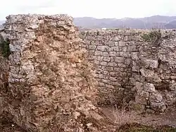 The polygonal irregular plan is defined by the walls, reinforced by two towers on the north and southern ends of the structure.[1][2] The height of the walls vary between three and five metres in height, while the structure is approximately 1.5 metres thick.