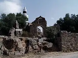 The remains of the walls and corbels are distributed in an elliptical area, whose major segment, 86 metres (282 ft), is oriented to the north, while a minor segment of 50 metres (160 ft) to the south.[1] What remains of the fortifications are: the base of a 13.5 metres (44 ft) wall in the west; a 3.3 metres (11 ft) line in the north, connected to rocks; a small wall to the east, also linked to the rocks; two 1.6 metres (5.2 ft) wide lines of walls, between 6.2–10.5 metres (20–34 ft), interconnected and forming an obtuse angle, terminating at a 2.9 metres (9.5 ft) corbel, in the south/southeast; and foundations of a wall 16 metres (52 ft) long to the south, from the cemetery to a corbel.[1][3]