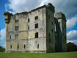 In the north of England improvements in the security of the Scottish border, and the rise of major noble families such as the Percies and the Nevilles, encouraged a surge in castle building at the end of the 14th century.[172] Palace-fortresses such as Raby, Bolton and Warkworth Castle took the quadrangular castle styles of the south and combined them with exceptionally large key towers or keeps to form a distinctive northern style.[173] Built by major noble houses these castles were typically even more opulent than those built by the nouveau riche of the south.[174] They marked what historian Anthony Emery has described as a "second peak of castle building in England and Wales", after the Edwardian designs at the end of the 14th century.[175]