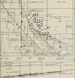 Oil discoveries in the 1880s and 1890s in Los Angeles County, and along the south coast of Santa Barbara County, encouraged drillers to investigate the northern part of Santa Barbara County, and they were quickly rewarded, with the discovery of the huge Orcutt field in 1901 and the Lompoc field in 1903. The first attempts to find oil in the Cat Canyon area took place in 1904, with two attempts by Rice Ranch Oil Co. to find oil or gas. Both wells failed on boulders and loose sand which plugged the well bores. Palmer Oil Company succeeded in 1908, drilling to 3,200 feet with a well that produced 150 barrels a day. Compared to the gigantic gushers of the Orcutt field, it was a modest success at first.[11] However, after several months it began to flow, and then spout, becoming an immense gusher producing in excess of 10,000 barrels per day before clogging up with sand and ceasing altogether.[12][13] Similarly, oil in the east area of Cat Canyon was discovered by Brooks Oil Company in 1909 when Well No. 1 was drilled to a depth of 2,615 feet.[14]