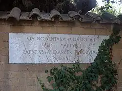 The basilica and Catacombs of Sant' Alessandro is a single-level catacomb, located in the Sant'Alessandro area of Municipio IV on the outskirts of Rome.[1] It was first built in the 7th century on the via Nomentana. It is dedicated to the martyr Alexander, as is known from an inscription inside the complex mentioning him alongside his companions Eventius and Theodolus - all three were probably martyred during the Diocletianic Persecution or in AD 116 under Trajan.[2]