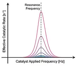 Oscillating binding energies of all surface chemical species introduces periodic instances of transient behavior to the catalytic surface. For slow oscillation frequencies, the transient period is only a small quantity of the oscillation time scale, and the surface reaction achieves a new steady state. However, as the oscillation frequency increases, the surface transient period approaches the timescale of the oscillation, and the catalytic surface remains in a constant transient condition. A plot of the effective catalytic rate of a reaction with respect to applied oscillation frequency identifies the 'resonant' frequency for which the transient conditions of the catalyst surface match the applied frequencies.[9] The catalytic rate at the resonance frequency exists above the Sabatier volcano plot maximum of a static system with average reaction rates as high as five orders of magnitude faster than that achievable by conventional catalysis.