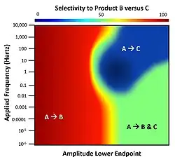 Application of dynamic binding energy to a surface with multiple catalytic reactions exhibits complex behavior derived from the differences in the natural frequencies of each chemistry; these frequencies are identified by the inverse of the adsorption, desorption, and surface kinetic rate parameters. Considering a system of two parallel elementary reactions of A-to-B and A-to-C that only occur on a surface, the performance of the catalyst under dynamic conditions will result in varying capability for selecting either reaction product (B or C).[12] For the depicted system, both reactions have the same overall thermodynamics and will produce B and C in equal amounts (50% selectivity) at chemical equilibrium. Under normal static catalyst operation, only product B can be produced at selectivities greater than 50% and product C is never favored. However, as shown, the application of surface binding dynamics in the form of a square wave at varying frequency and fixed oscillation amplitude but varying endpoints exhibits the full range of possible reactant selectivity. In the range of 1-10 Hertz, there exists a small island of parameters for which product C is highly selective; this condition is only accessible via dynamics.[13]