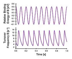 Implementation of dynamic surface binding energy of a reversible A-to-B reaction on a heterogeneous catalyst in a continuous flow stirred tank reactor operating at 1% conversion of A produces a sinusoidal binding energy in species B as shown.[8] In the transition between surface binding energy amplitude endpoints, the instantaneous reaction rate (i.e., turnover frequency) oscillates over an order of magnitude as a limit cycle solution.