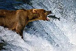 Catch of the Day is a 1988 wildlife photograph by Thomas D. Mangelsen. Taken at Brooks Falls in Alaska's Katmai National Park and Preserve, it depicts a sockeye salmon leaping from the water into the mouth of an Alaskan brown bear, immediately before the bear eats the fish. It has been described as iconic[1][2] and one of, if not the most, famous wildlife photographs ever taken.[3][4]