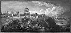 The modern Cathedral of Our Lady of the "Omen" is on the site of the city fortress of Kursk from the early 17th century.[6] In 1612, the city was captured and devastated by seventy thousand troops of Polish-Lithuanian invaders under the command of Hetman Zholkevsky. However, the city fortress remained impregnable to the enemies.[7][8] It was heroically defended under the leadership of the voevoda stolnik Yuri Ignatyevich Tatishchev.[9] The people of Kursk believed that their survival was due to the intervention of the Virgin Mary. In gratitude, they promised to build a monastery in honor of the Theotokos of Kursk, also known as the "Omen". This monastery was later moved to the royal chambers in Moscow.[10]