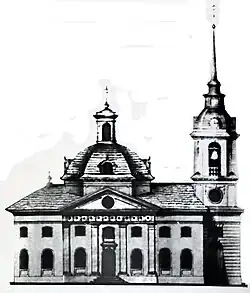 In 1688, the sovereigns Ivan and Peter Alexeevich and Sophia Alexeevna were given a large bell as a gift.[18] It was made by master Fyodor Matorin and weighed 57 pounds. It was used in the new stone church, which had two side chapels (St. Alexis, a man of God, and Demetrius of Solunsk).[19][20] The bell was used for about two hundred years. In 1680, the cracked bell was removed from the bell tower and placed on a high pedestal in the northeastern part of the monastery fence. The new cathedral was 58 m long and 11.5 m wide. In 1752, it was plastered inside and out. Its only chapter was dismantled, and five were erected in its place. From 1771 to 1775, under the spiritual leader Archimandrite Victor (Lodyzhensky), the throne in the church was covered with gilded copper, depicting the Passion of Jesus, and the iconostasis was decorated with new paintings and gilding. During the renovations, church services were held in the Church of the Epiphany of the Lord. In 1775, the domes of the Cathedral of Our Lady of the "Omen" were gilded.[21][22] In November 1814, during a service, pieces of plaster fell from the cathedral's dome. An examination of the building revealed cracks in the refectory vault and on the walls of the temple. These cracks were formed as a result of subsidence of its foundation. In 1815, the Cathedral of Our Lady of the "Omen" was dismantled.[15][23]