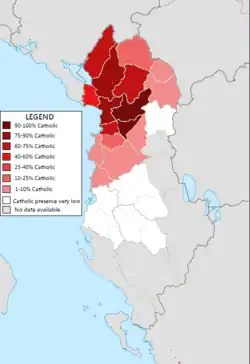 Distribution of Catholics in Albania as according to the 1918 census. Data unavailable in the South and East due to political instability.