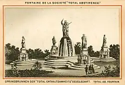 The Catholic Total Abstinence Union Fountain (1874–1877) – also known as The Catholic Total Abstinence Centennial Fountain or The Centennial Fountain – is a now-defunct ornamental fountain and drinking fountain located in West Fairmount Park, Philadelphia, Pennsylvania. Created as an attraction for the 1876 Centennial Exposition, it was commissioned by the Catholic Total Abstinence Union of America, a religious organization that advocated for total abstinence from alcohol.