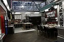 The interior of the Celebrity Big Brother house has a New York City theme from around the 1940s.[22] Each of the bedrooms on the first floor were given their own individual names reflecting their design. The first bedroom has a "5th Avenue" theme inspired by window shopping highlighting "the highest fashion of the '40s" while the second bedroom has a luxury "Hotel" theme. The third bedroom, known as the "Celebrity Building" Bedroom, that was inspired by a famous art deco building named after a car company.[19] The kitchen was inspired by some of the finest restaurants in New York City with a "faux French" oven island and a square dining room table. Behind the dining room table cartoon-style pictures of the season one HouseGuests hanging on the wall.[22] The bathroom and downstairs lounge area were inspired by the 20th Century Limited passenger train.[20] The Head of Household bedroom resembles the backstage of a Broadway show with the head board made from a real theater marquee.[21] The upstairs lounge was designed after the Brooklyn Bridge, while the gym area was inspired by the 42nd Street library in Manhattan.[23]