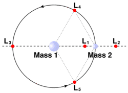 Following Newton, mathematicians attempted to solve the more complex problem of predicting the future motion of three bodies interacting through gravity: the three-body problem. The first to provide a periodic solution was the Swiss mathematician Leonhard Euler, who in 1762 demonstrated three equilibrium points lie along a straight line passing through the two primary masses. If a body of infinitesimal mass occupied one of these points, it would remain there in a stable orbit. French mathematician Joseph-Louis Lagrange attempted to solve this restricted three-body problem in 1772, and discovered two more stable orbits at the vertices of equilateral triangles with the two primary masses. Collectively, these solutions became known as the Lagrange points.[6]