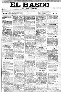 Since the mid-1890s Alcocer focused his political endeavors on Vascongadas instead of Old Castile. He was noted taking part in various local Traditionalism-flavored events, e.g. in 1896 in Bilbao.[60] In 1897 he assumed management of the Carlist daily El Basco, published since 1884 in the Biscay capital.[61] His tenure was rather brief. Already in 1898 first the periodical was suspended by military authorities,[62] and then charges were brought against him, though it is not clear what exactly triggered the juridical action;[63] he spent some time in detention.[64] Eventually El Basco ceased to appear. In 1899 he was probably involved in Carlist conspiracy, gearing up towards an eventually abandoned rising; a later hagiographic account in aesopian language hinted at his taking part.[65] The only official engagement of this year was his taking part in a Catholic congress, where he represented Orduña.[66]