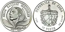 A memorial to and mausoleum for Celia Sanchez was built in Parque Lenin. However, As of November 2014 the remains of Celia Sanchez are interred in the Colon Cemetery, Havana. The Celia Sánchez Memorial in Manzanillo also honors her name, and her face appears in the watermark on Cuban peso banknotes. Cuba continues to honor Sánchez achievements, ten years after her death, they created a coin with the value of 10 pesos. (1990)
