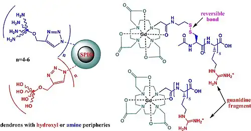 SPIO nanoparticles confer high sensitivity in MRI but they have lower affinity for cells; they work at high concentrations. Functionalizations of these compounds using dendrimeric guanidines showed similar activities as TAT-based CPPs but higher toxicity. New substrates based on dendrons with hydroxyl or amine peripheries show low toxicity. Applications of SPIO includes cell labeling in vivo; due to low toxicity, they are clinically approved for use in liver, spleen, and gastrointestinal imaging.[81]