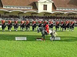 On the last two weekends in September and the first weekend in October, the State Stud of Celle puts on a stallion parade or hengstparade. The parades are a major tourist attraction every year. The tradition of exhibiting all the state-owned sires to the public began in 1908.[10] Stallions perform in a variety of acts, some showcasing their performance capabilities in dressage or show jumping demonstrations, while others are shown in-harness. Highly coordinated, color-matched drill teams are perennial favorites. The parade is an opportunity for the stud to showcase the less competitive talents of the stallions, as well. Stallions may be driven in groups of up to thirteen at a time, or in trick-riding formations called "Roman riding."[11] For many years, the solid black Escudo II performed tricks on cue with a handler, without a saddle or a bridle.