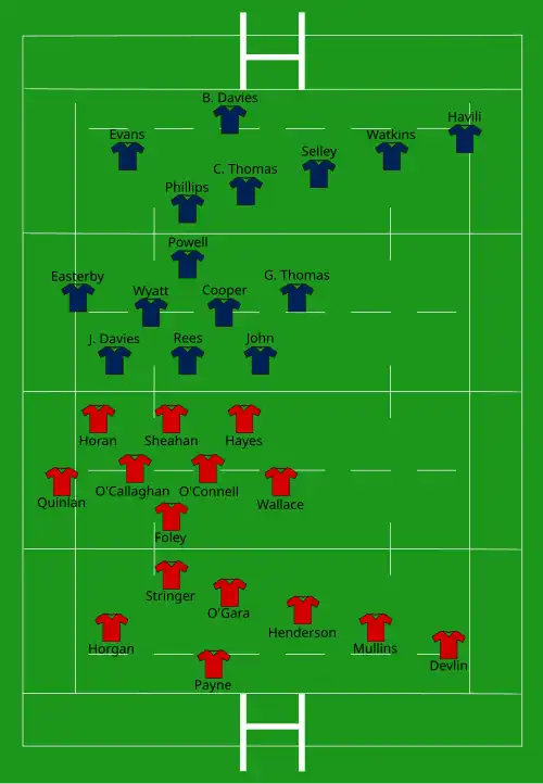 | Try: Horgan 6' c O'Gara 22' c Mullins 76' c Con: O'Gara (3/3) Pen: O'Gara 39' Drop: O'Gara 40' | Report | Try: Phillips 34' c Con: C. Thomas (1/1) Pen: C. Thomas (3) 12', 42', 59' |